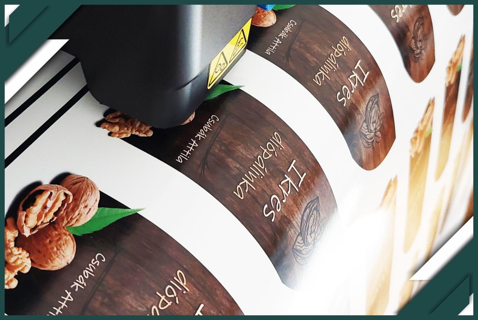 A számítógépes grafikát kültéri, hosszú távú használatra tervezett polimer öntapadós vinylre nyomtatjuk, mely a latex nyomtatási technológiának köszönhetően vízálló és a karcoknak is jól ellenáll, legyen szó cégesített címkékről, melyeket termékekre szoktak ragasztani, vagy ajándéknak szánt matricákról, esetleg pálinkás, mézes, lekváros üvegre ragasztott címkékről.