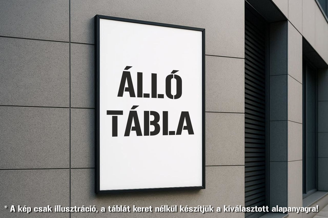 Figyelem! A kép csak illusztráció! A táblákat keret nélkül készítjük el a kiválasztott alapnyagra! Amennyiben kis méretű táblákból (1 négyzetméter alatt) több darabot szeretnél rendelni, akkor kérj ajánlatot elérhetőségeinken, mivel kedvezőbb árat tudunk adni! Tábláink tartós polimer vinyl, műanyag- vagy alumínium szendvicslemez felhasználásával készülnek latex nyomtatási technológiával, mely révén magas minőségű és az idájárási viszonyoknak ellenálló táblát készítünk. A festék vízbázisú, ezért az egészségre nem káros, viszont az optimizernek és a 120 C fok hőmérsékletnek köszönhetően a nyomatok magas kopásállósággal és fakulásállósággal rendelkeznek. RENDELÉS MENETE 1.) Válaszd ki a megfelelő méretet! A különböző fajták külön menüpontban találhatóak, ha nem megfelelő a jelenlegi, akkor kattints valamelyik gombra! Ha nem találsz megfelelő méretet, kérj ajánlatot egyedi méretű tábla készítésére elérhetőségeinken, mivel el tudunk készíteni bármilyen méretet! 2.) Válaszd ki, hogy milyen alapanyagra kasírozzuk fel a vinylre nyomtatott grafikádat. 3 mm vastag habosított műanyaglemez: Ez egy könnyű PVC lemez, mely nem kemény, fel van habosítva, ezért akár szúrkálható is jelölőtűvel. Kültéren is használható és beltéren is, viszont mivel nagyon vékony, ezért nehezen viseli a hőmérséklet ingadozást. Mindenképp olyan felületre javasoljuk felhelyezni, amely hátulról megtámasztja a táblát, valamint a felhelyezéskor a furatnak 1-2 mm-rel nagyobbnak kell lennie mint a csavar és nem szabad teljes erővel meghúzni, hogy a hőmérséklet ingadozáskor a tábla tudjon tágulni és zsugorodni. Ellenkező esetben a tábla meghajolhat. 5 mm vastag habosított műanyaglemez: Tulajdonságaiban majdnem megegyezik a 3 mm-es változattal, viszont vastagabb, ezért még ellenállóbb a hőmérséklet ingadozásnak, de ennél is javasoljuk a hátsó megtámasztást. Viszont nehezebb. 2 mm vastag alumínium szendvicslemez: Ez egy speciális tábla alapanyag, melynél a tábla közepén egy műanyag lemez található, amit két oldalról egy-egy vékony alumínium lemez zár össze, erre kasírozzuk a nyomatot. Ez egy nagyon ellenálló és merev tábla alapanyag, a kisebb méretűek mereven megállnak hátsó megtámasztás nélkül is, viszont itt is ügyelni kell arra, hogy ne legyen erősen megszorítva a rögzítő csavarral, így a tábla a hőingadozás esetén tud tágulni és zsugorodni. Nagyobb méretű tábláknál vagy meg kell támasztani hátulról, vagy inkább a 3 mm-es változatot javasoljuk. 3 mm vastag alumínium szendvicslemez: Tulajdonságaiban majdnem megegyezik a 2 mm-es változattal, viszont merevebb, így nagyobb méretű tábláknál ezt a változatot javasoljuk. 3.) Választhatsz egyéb kiegészítő szolgáltatást: 4 db furat a sarkokban: Nagyobb táblák esetében további furatokat készítünk, ilyen esetben felvesszük veled a kapcsolatot és megbeszéljük a furatok számát. A tábla tartó egy kimondottan erre a célra készült konzol, melyek egy bizonyos távolságot tartanak a faltól, eltakarja a csavarokat is így sokkal esztétikusabb lesz a falra szerelt tábla. Itt is fontos, hogy nagyobb méretnél több konzol szükséges, mely esetén felvesszük veled a kapcsolatot és megbeszéljük a mennyiséget. Fóliázás UV védett fóliával 1 oldalon: A fóliázással lényegesen meghosszabbítható a táblán található nyomat élettartama, így mindenképp javasoljuk kültérre. Beltéren, ahol nem éri sok napfény nem szükséges használni. Kétoldalas nyomtatás: A kapott grafikát vagy grafikákat kinyomtatjuk és a tábla mindkét oldalára felkasírozzuk. Fólázás UV védett fóliával 2 oldalon: Abban az esetben, ha kétoldalas nyomtatással kéred a táblát, akkor a fóliázást is két oldalon végezzük el, hogy mindkét nyomatot védje a külső hatásokkal szemben. 4.) Tölts fel képet! Nagyon fontos, hogy jó minőségű képet tölts fel, mivel csak úgy tudunk jó minőségű táblát készíteni. A képet ellenőrizni fogjuk, és ha valamilyen rendellenességet tapasztalunk azt jelezni fogjuk. 5.) Tedd a kosárba! Ezek után nincs más dolgod, mint a "Kosárba" gombra kattintani, és a rendelést leadni vagy nézelődhetsz még webáruházunkban. |